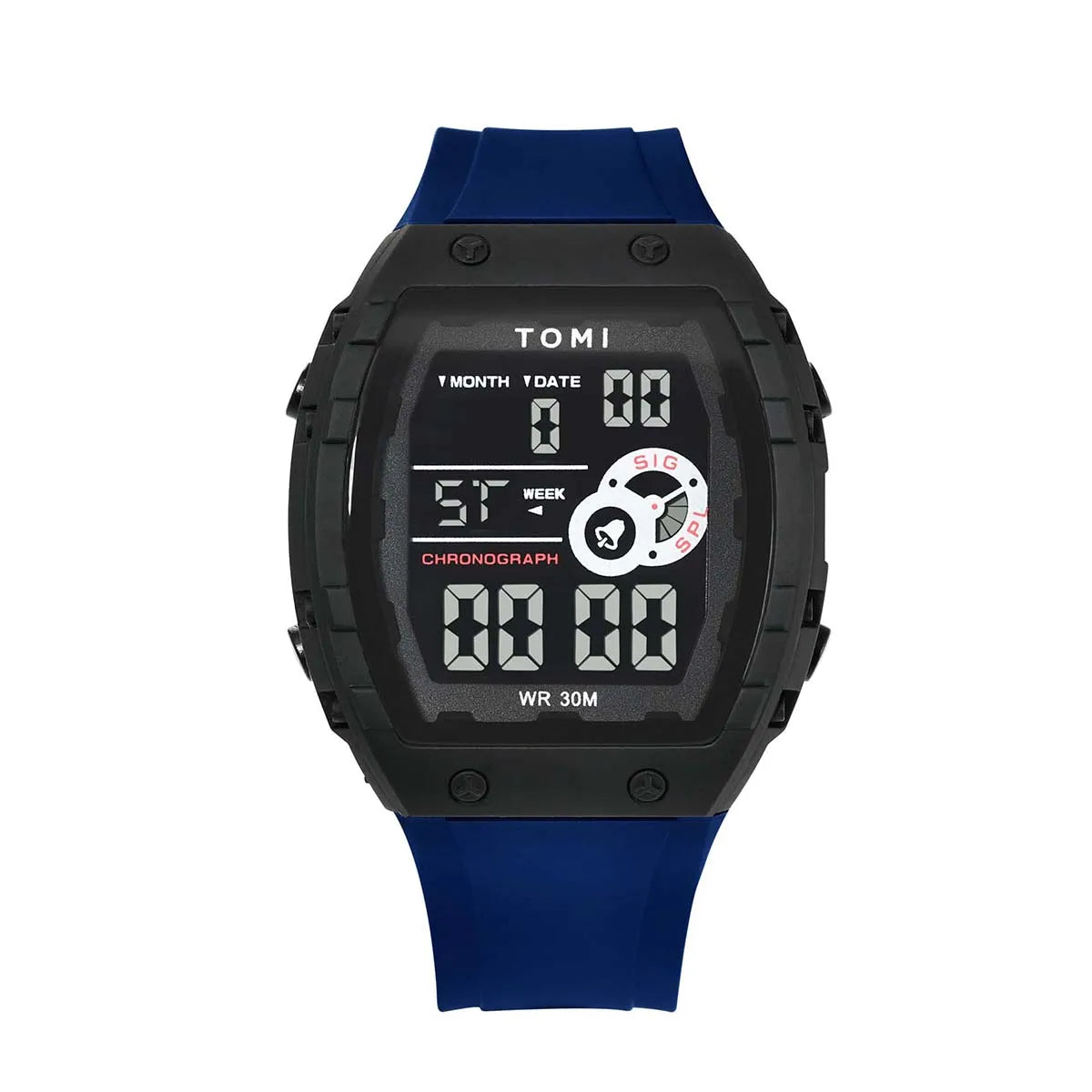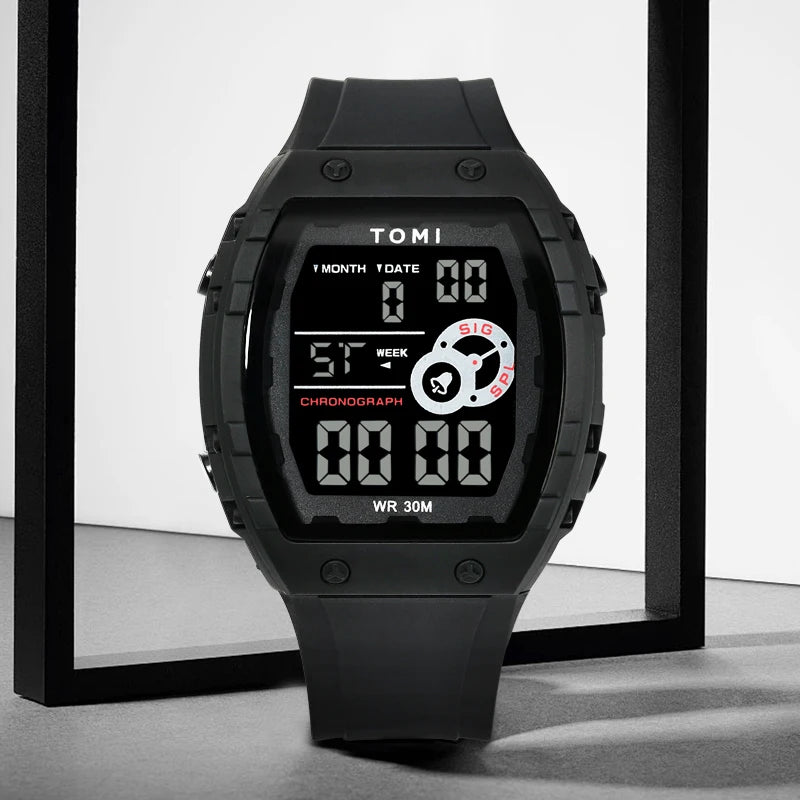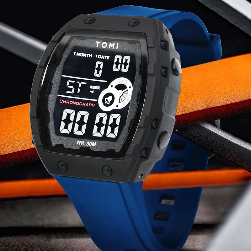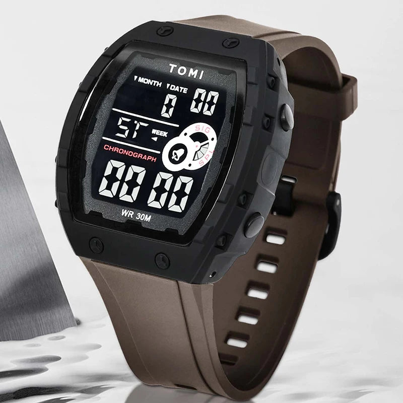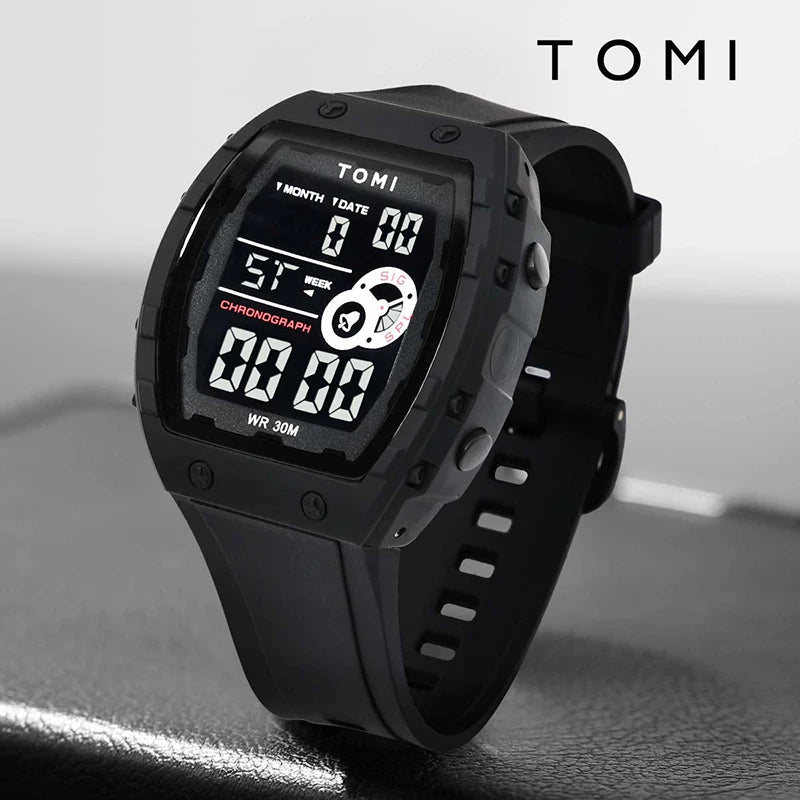TOMI introduces the T209 Future, a timepiece crafted with Polyester case and PU band. This innovative digital watch features a distinctive rectangular design with multi-zone luminous display, complete calendar, alarm, and week display, all housed in a contemporary 50mm vertical case with Digital movement and 3Bar water resistance. The sleek 15mm profile combined with integrated 20mm sport band delivers modern urban aesthetics and comprehensive functionality, making it perfect for those who appreciate futuristic design with advanced digital features and unconventional style.