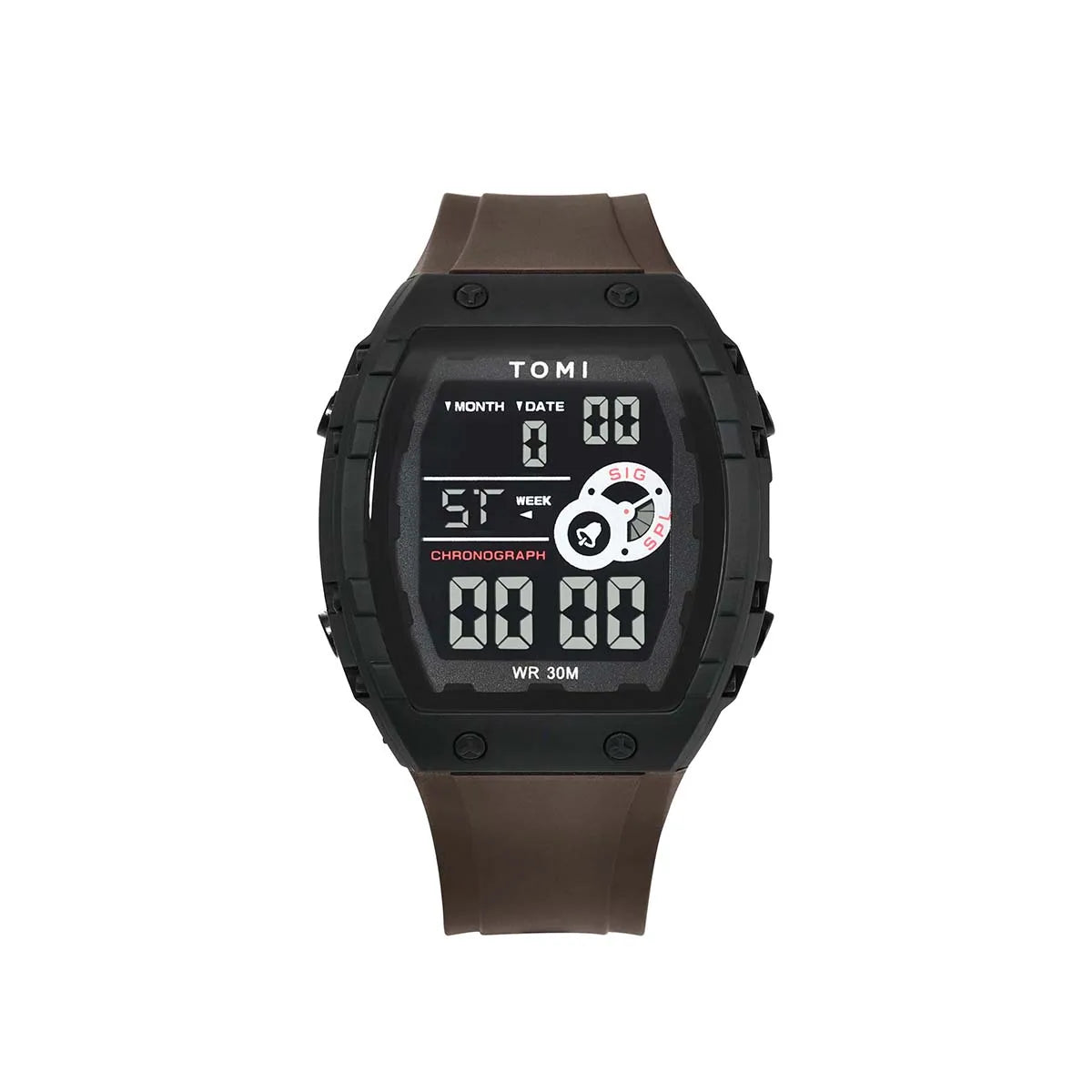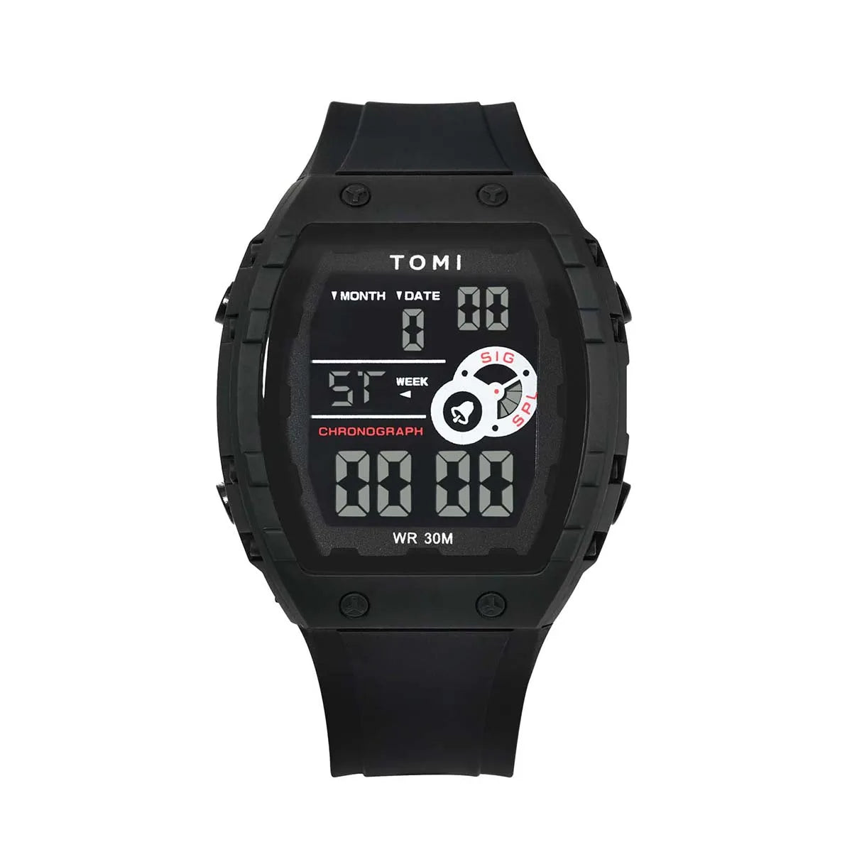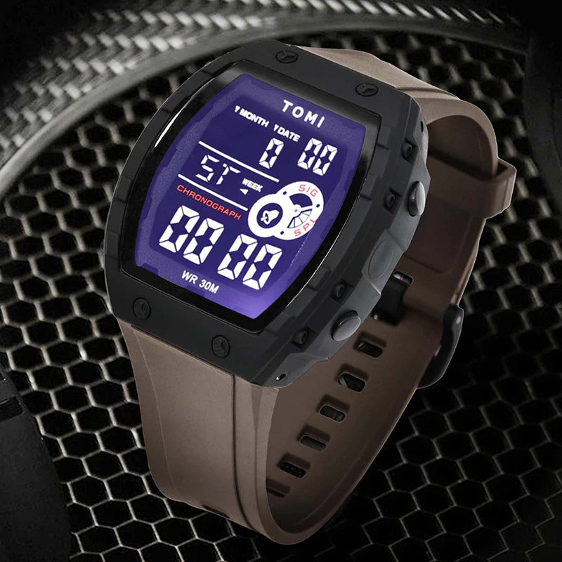 TOMI introduces the T209 Future, a timepiece crafted with Polyester case and PU band. This innovative digital watch features a distinctive rectangular design with multi-zone luminous display, complete calendar, alarm, and week display, all housed in a contemporary 50mm vertical case with Digital movement and 3Bar water resistance. The sleek 15mm profile combined with integrated 20mm sport band delivers modern urban aesthetics and comprehensive functionality, making it perfect for those who appreciate futuristic design with advanced digital features and unconventional style.