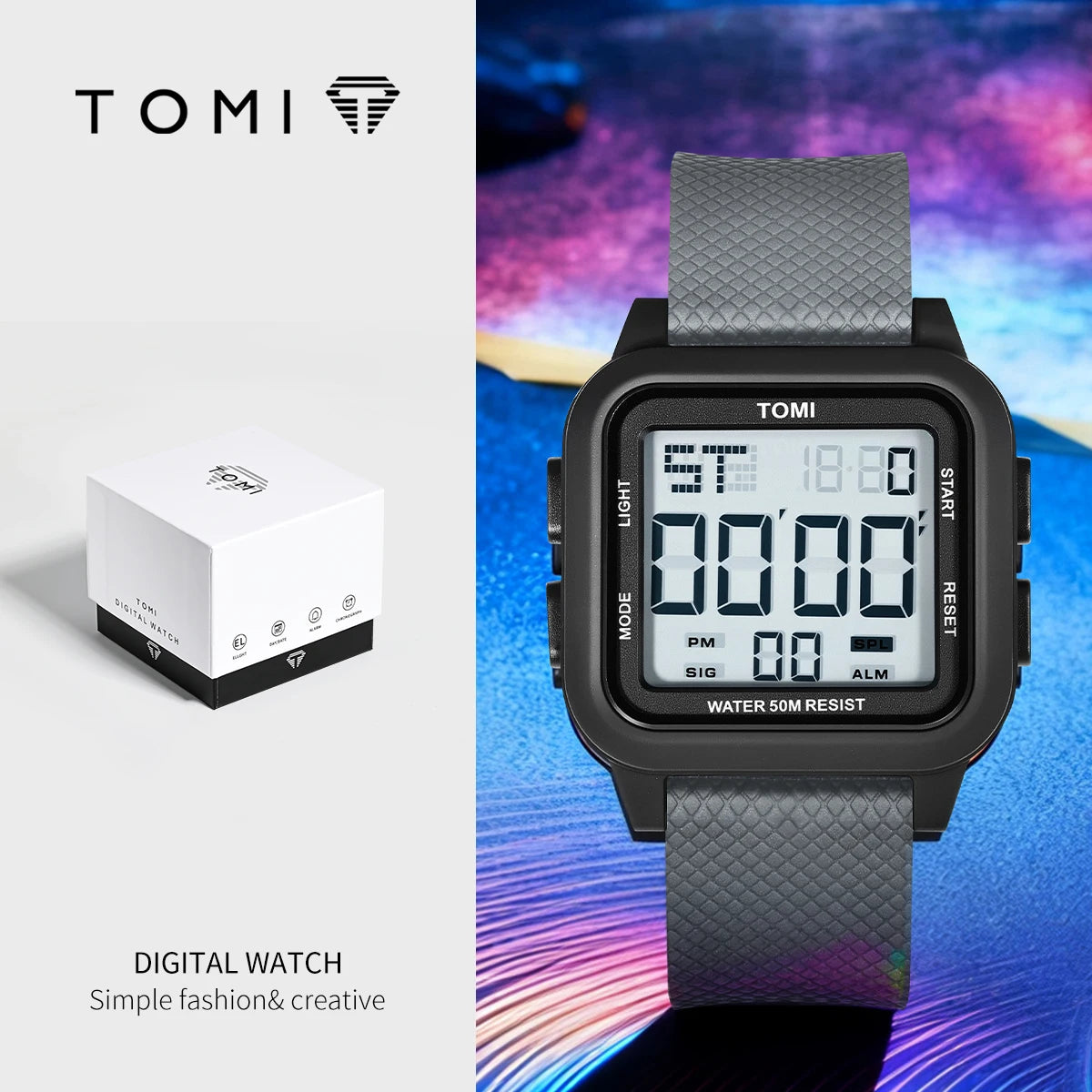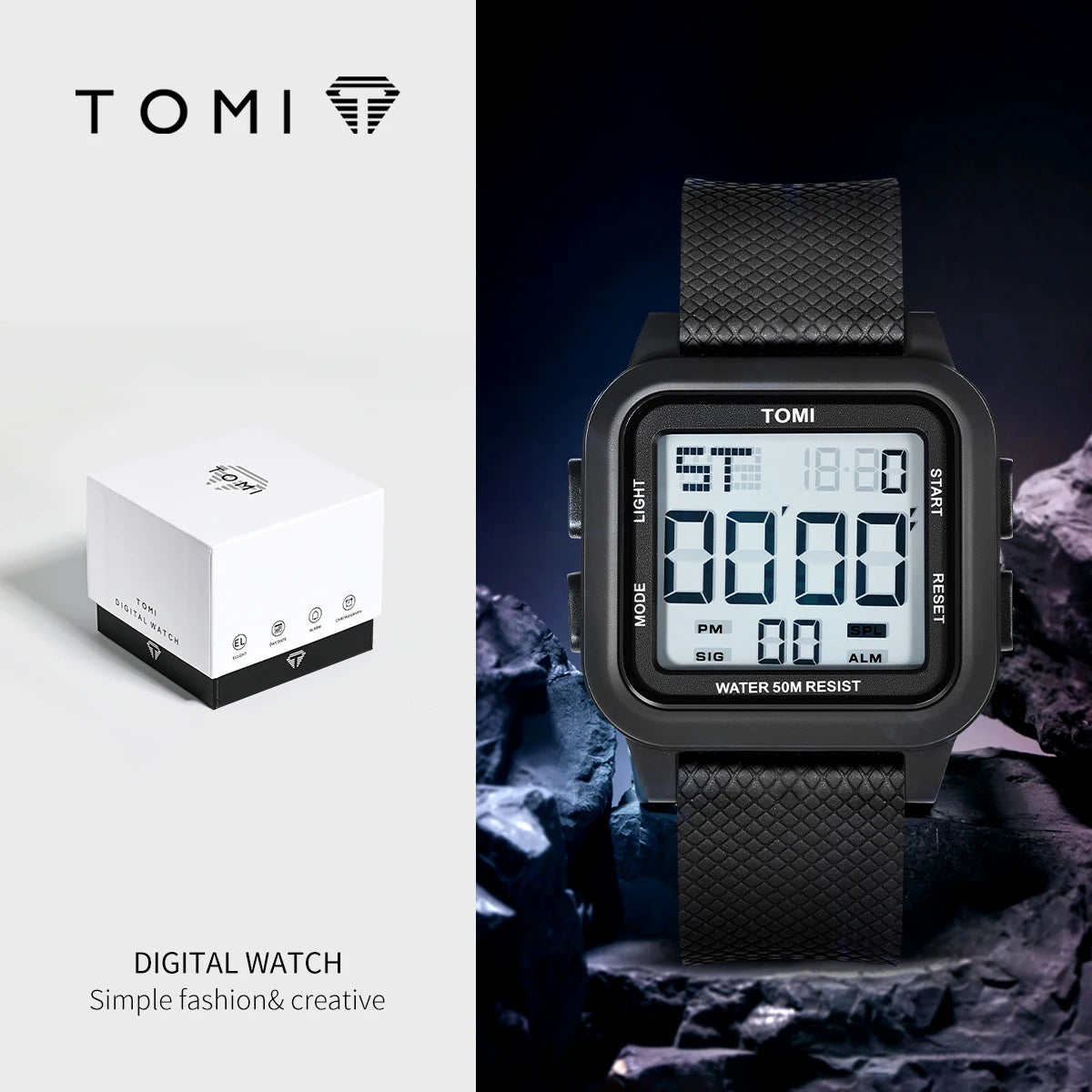 TOMI introduces the T216 Urban Pixel, a timepiece crafted with Plastic case and Silicone band. This contemporary digital watch features a minimalist square design with high-contrast luminous display, all housed in a sleek 42mm case with carbon fiber texture accents and Digital movement with 3Bar water resistance. The comfortable 12mm profile combined with textured 21mm silicone band delivers modern urban style and all-day wearability, making it perfect for those who appreciate clean digital aesthetics with casual functionality and contemporary design.