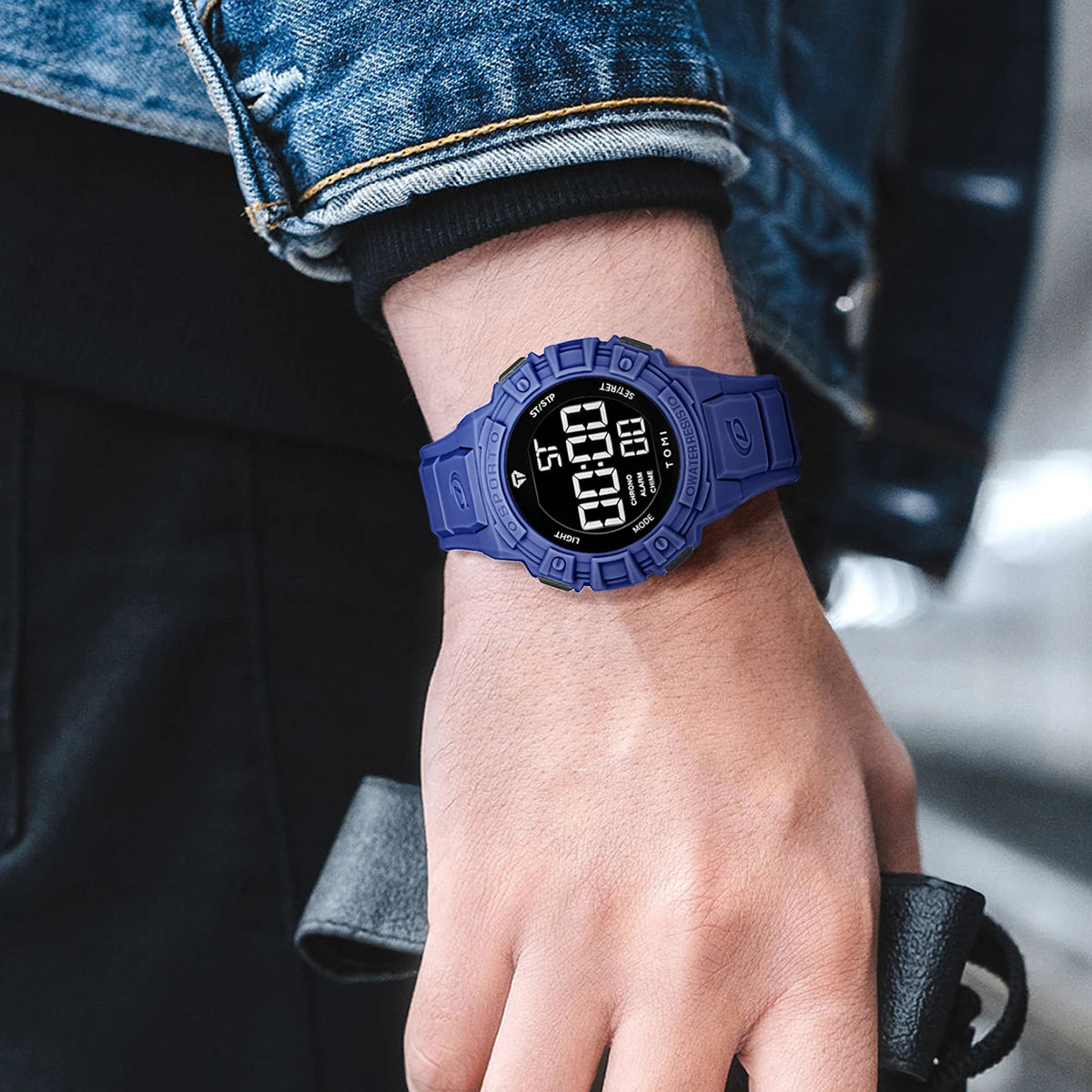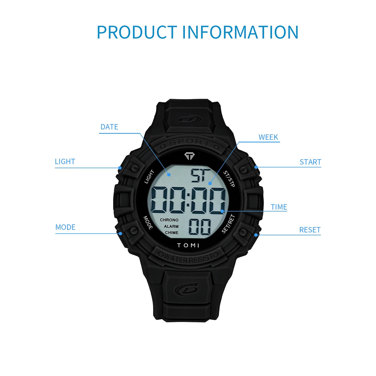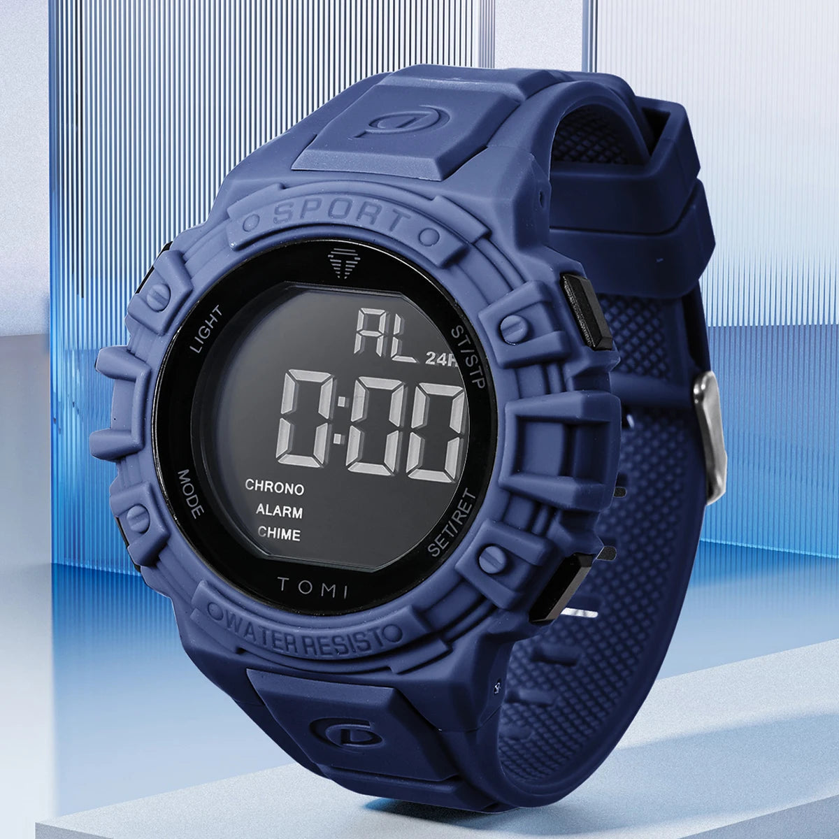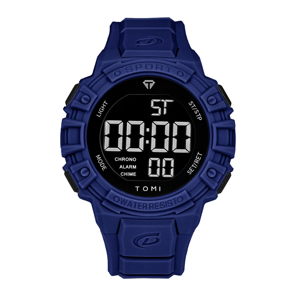 TOMI introduces the T221 Fortress Anthem, a timepiece crafted with Polyester case and PU band. This robust tactical watch features a high-contrast circular digital display with complete calendar and week display, all housed in a fortress-like 50mm case with multi-point protective construction and Digital movement with 3Bar water resistance. The substantial 15mm case thickness combined with 24mm wide textured sport band delivers maximum shock protection and commanding presence, making it ideal for outdoor activities, training sessions, and tactical operations requiring reliable timekeeping and durability.