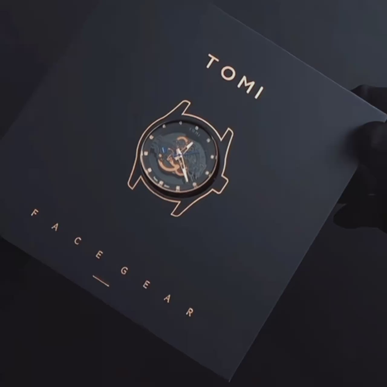 Black wristwatch with intricate design and TOMI branding, displayed with packaging on a dark background.
