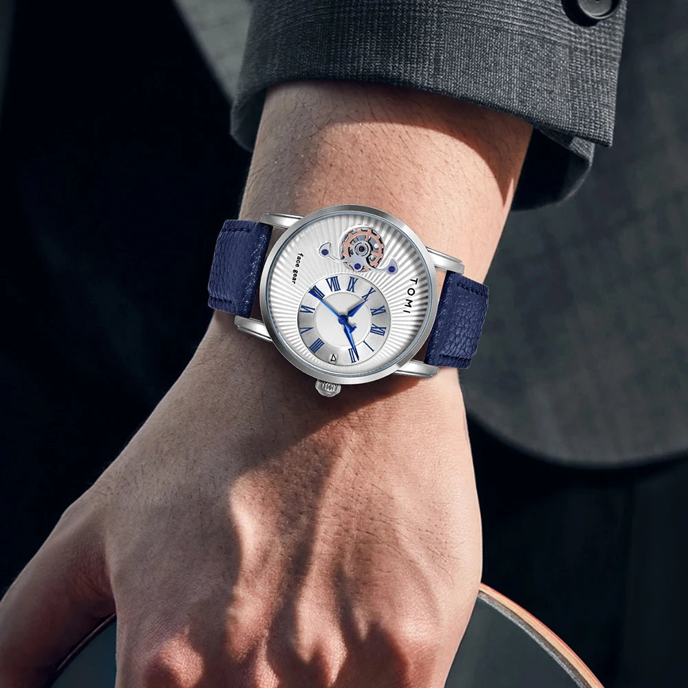 TOMI introduces the T104 Ridge Infinite, a timepiece crafted with Alloy case and Leather band material. Featuring a complete calendar function with distinctive Roman numeral markers and visible mechanical elements on the dial, this watch showcases technical sophistication. Powered by precise Quartz movement and 3Bar water resistance, the glass dial window ensures clarity while displaying its intricate design for refined everyday style.