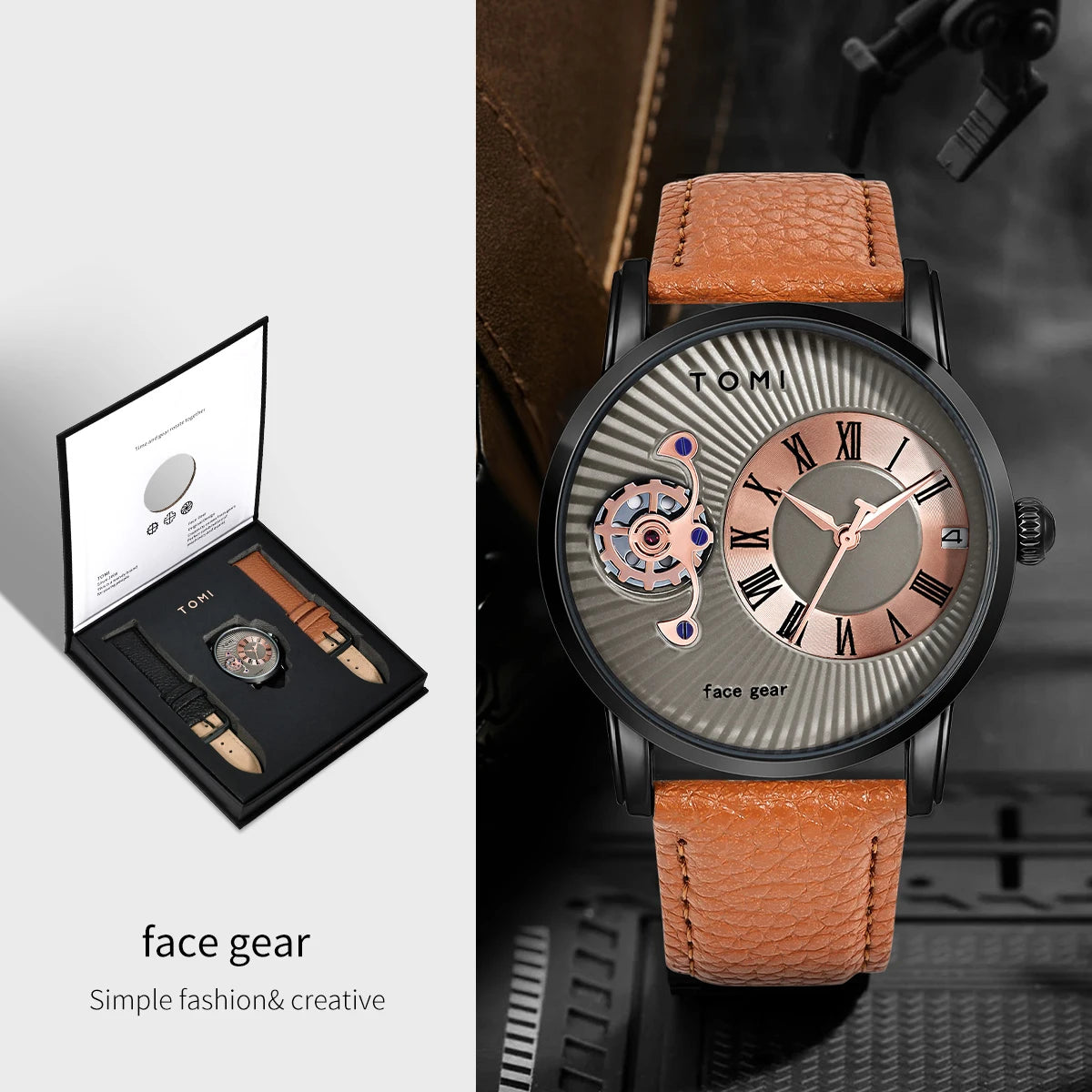 TOMI watch with black leather strap and visible mechanism, displayed with packaging on a textured background.