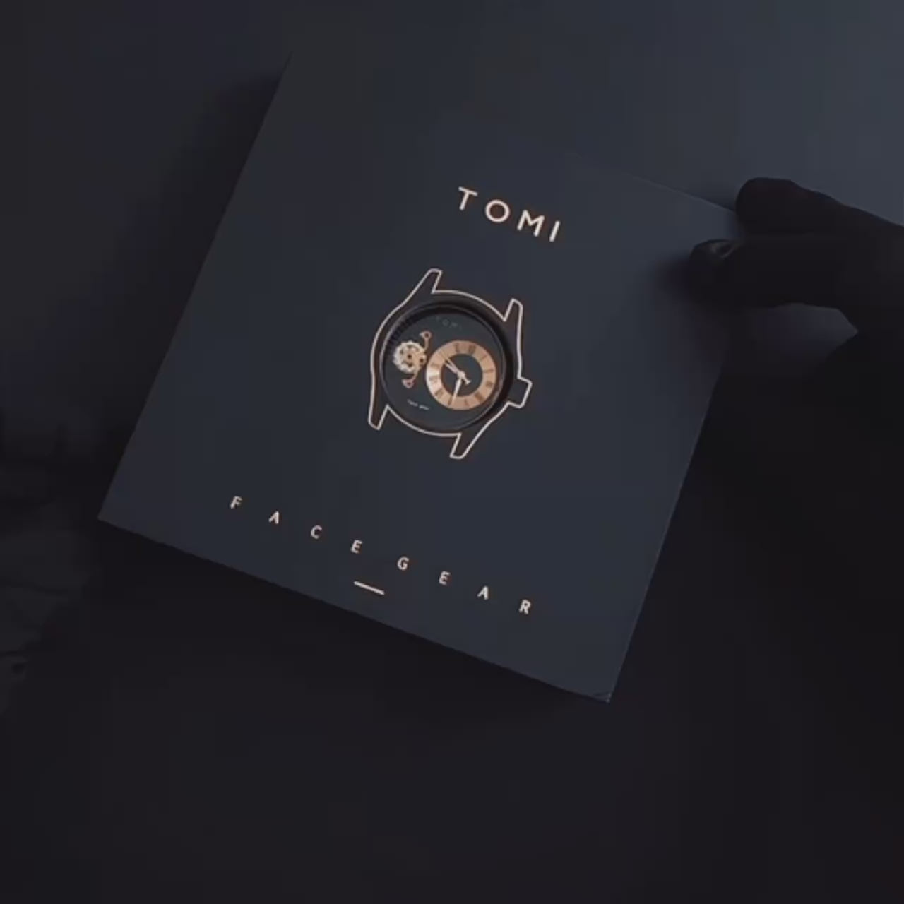 Black watch with rose gold accents and TOMI branding, displayed with packaging.