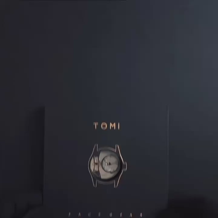 Tomi watch with black strap and rose gold case on a dark surface, next to an open box with additional watches.