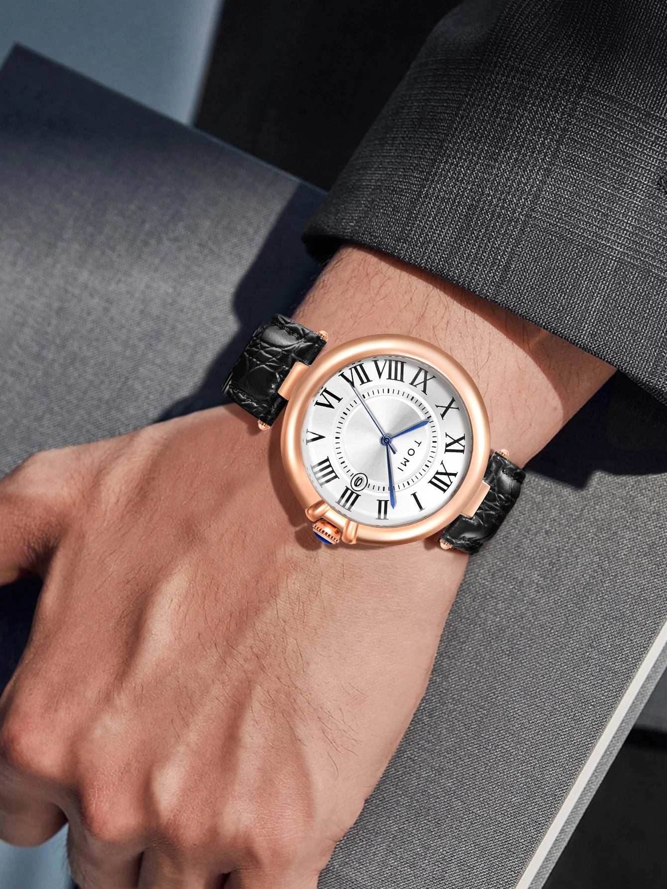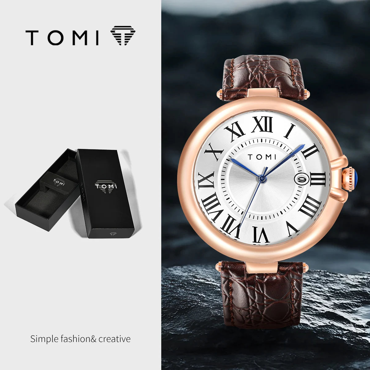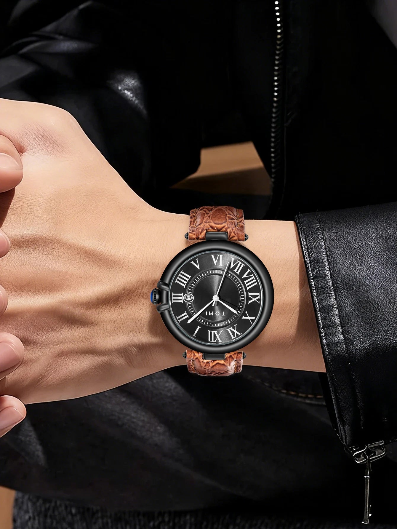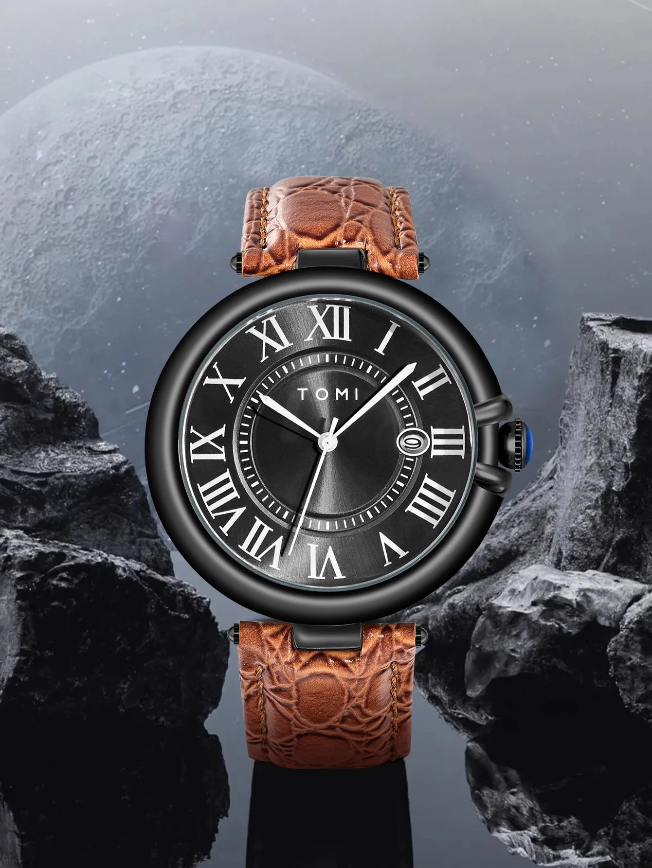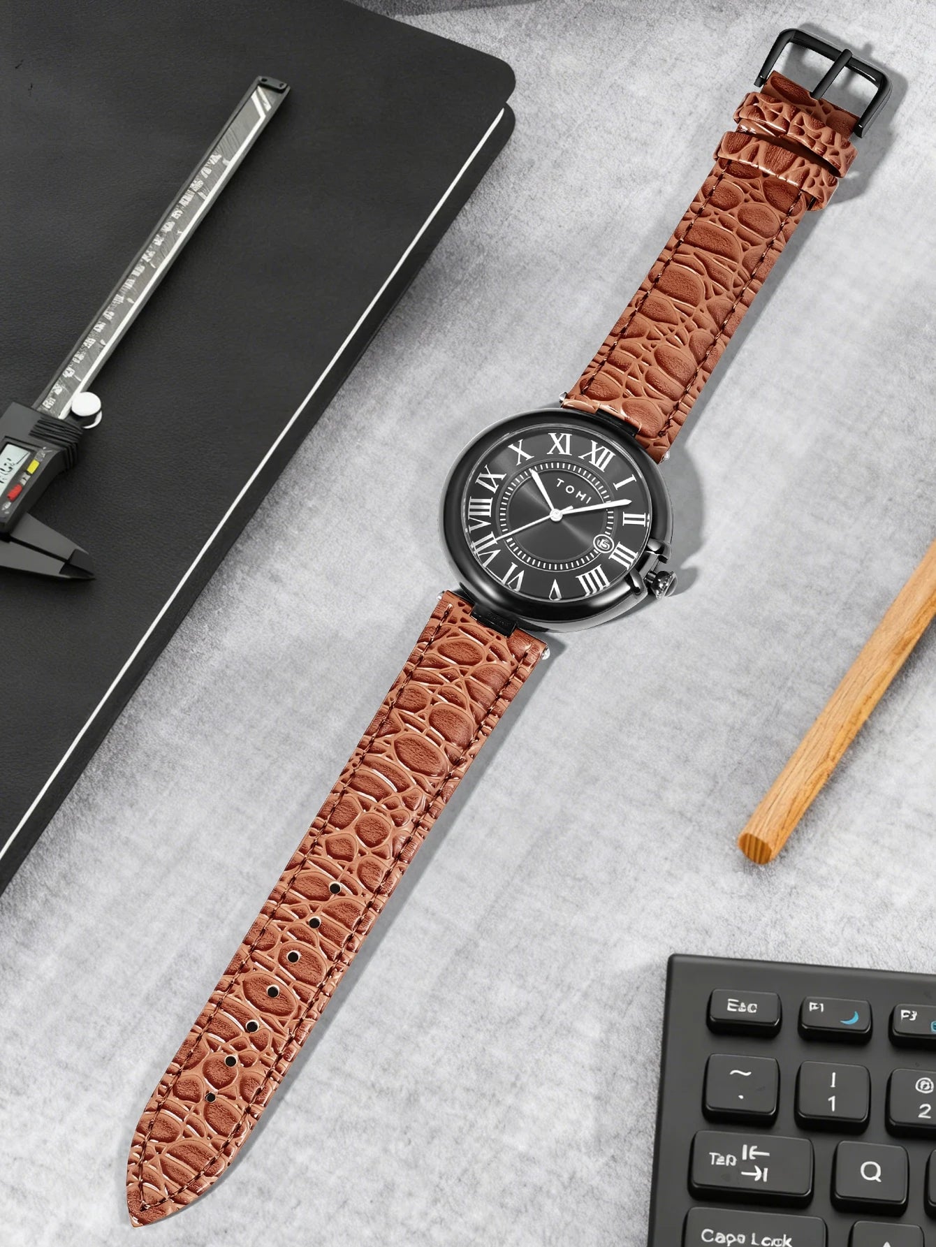 TOMI introduces the T075 Quasar Chapter, a timepiece crafted with Alloy case and PU band. This elegant watch features a classic round design with Roman numeral markers and complete calendar function, powered by precision Quartz movement with 3 Bar water resistance. The 40-44mm case with 10.5mm thickness delivers refined sophistication, while the textured band adds distinctive character. Perfect for those who appreciate timeless elegance with contemporary reliability.
