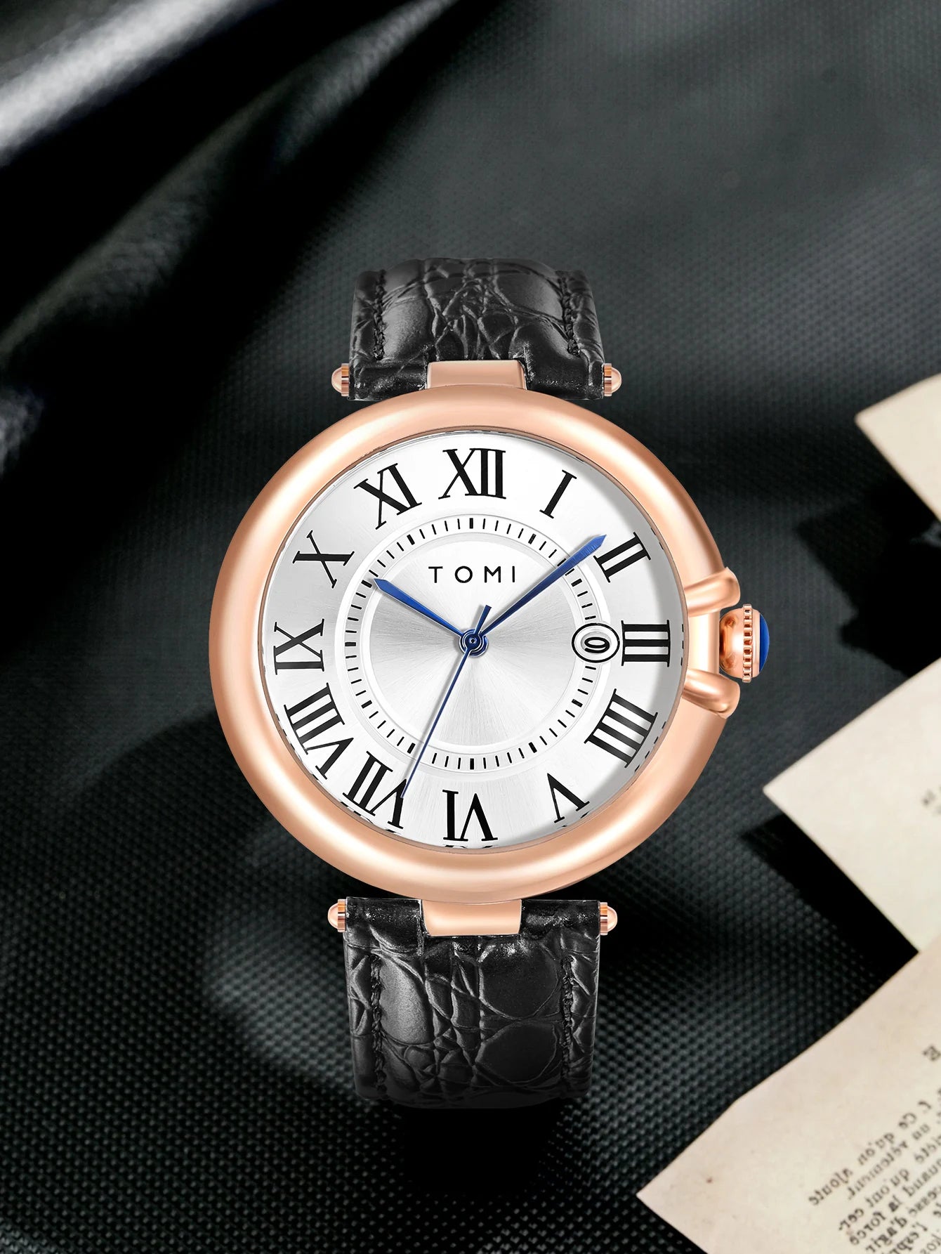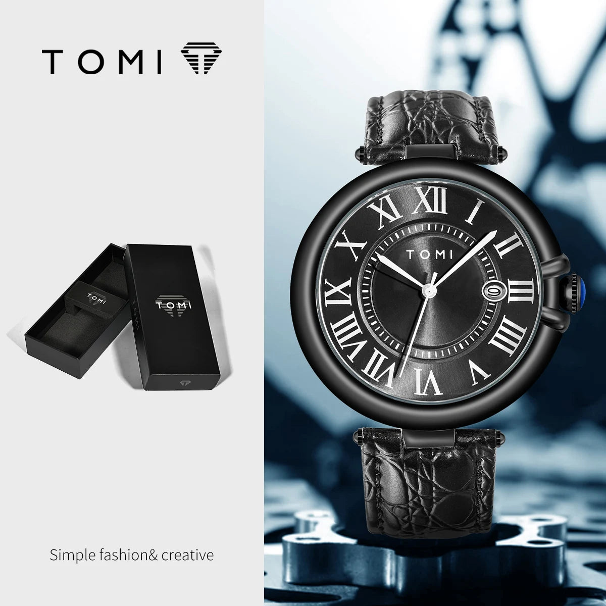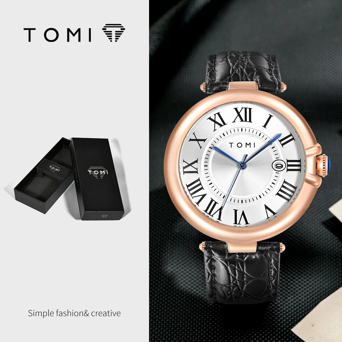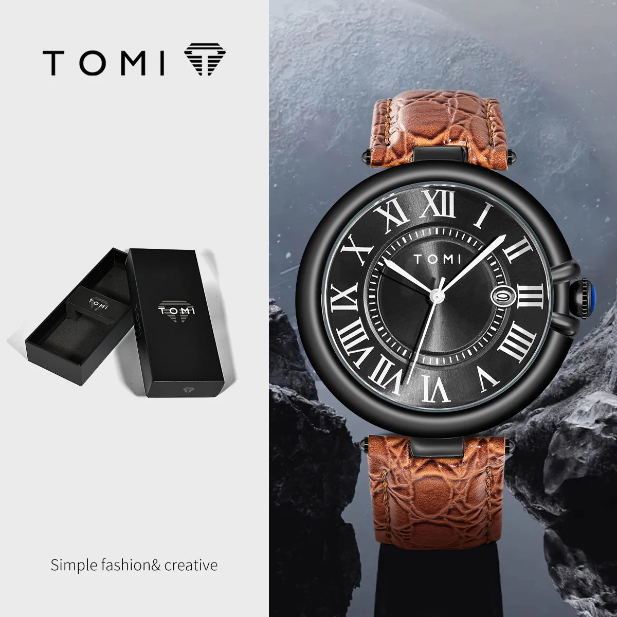 Tomi watch with black leather strap and rose gold case on a dark background, with TOMI branding.