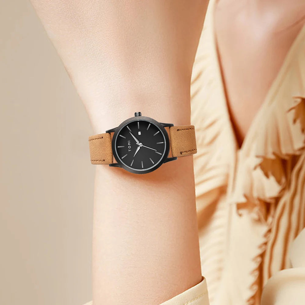Brown wristwatch with black dial on a beige background, featuring the TOMI brand.