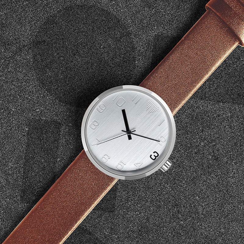 Wristwatch with brown leather strap and silver case on a dark textured background