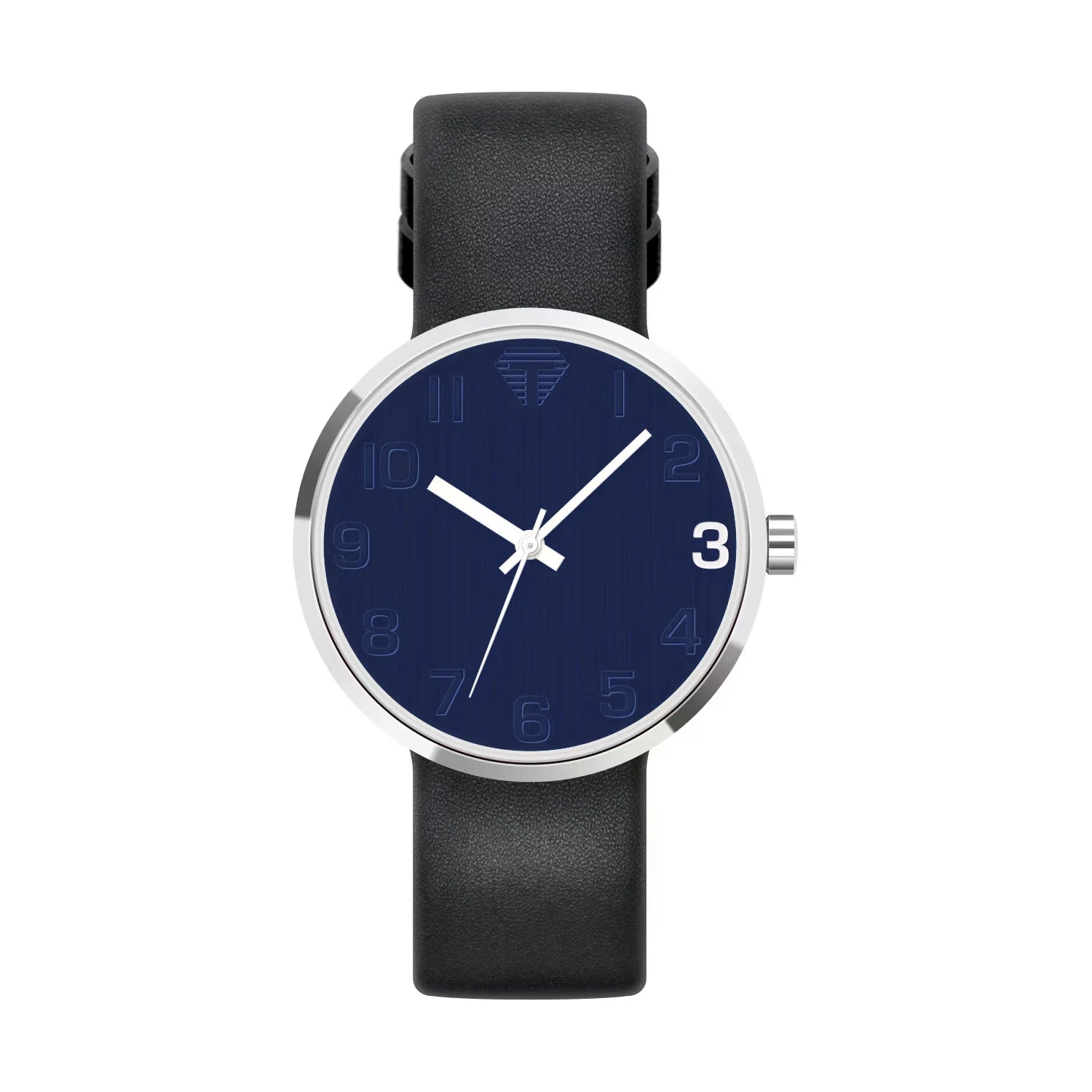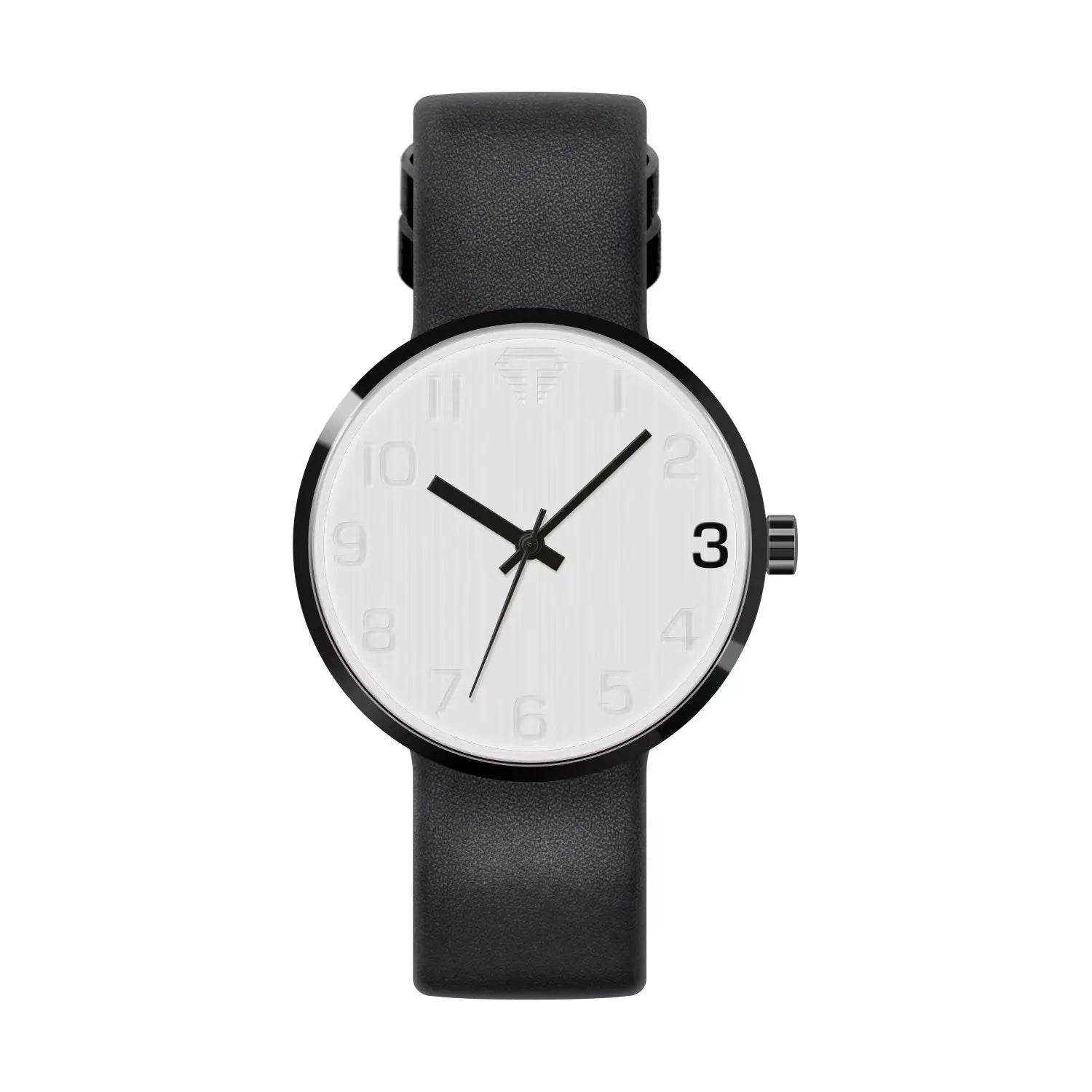 Black wristwatch with a white face on a white background