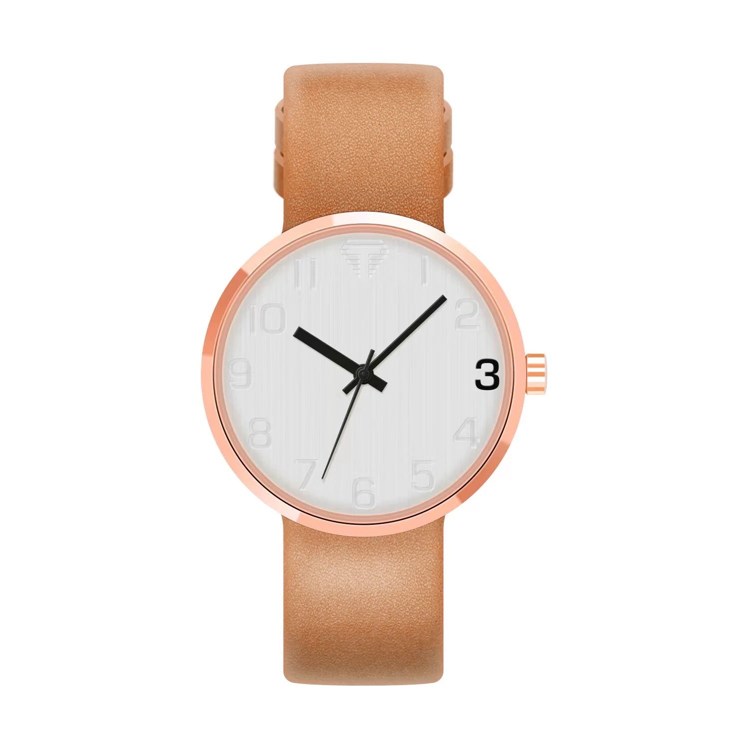Wristwatch with brown leather strap and rose gold case on white background