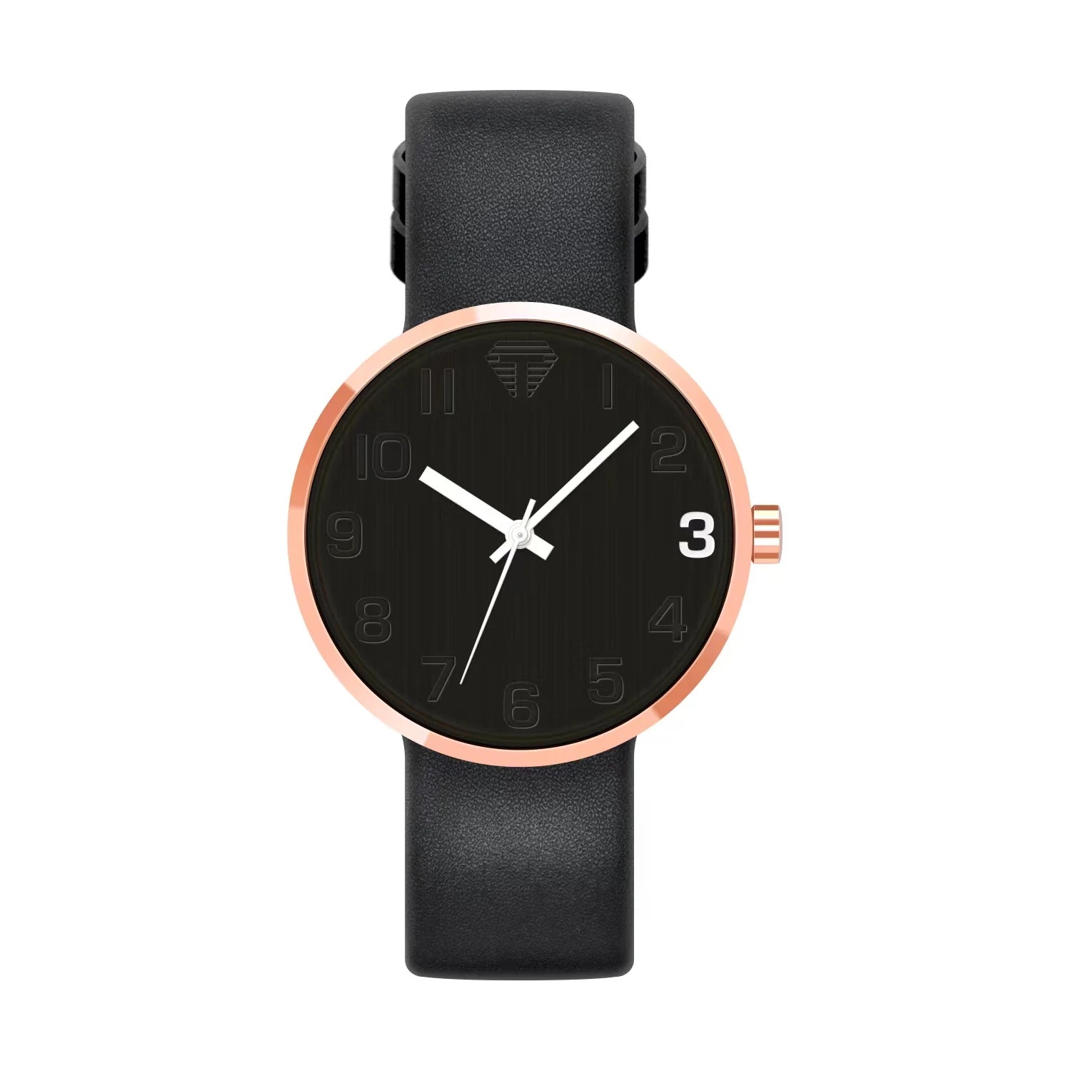 Black watch with a rose gold bezel and black strap on a white background
