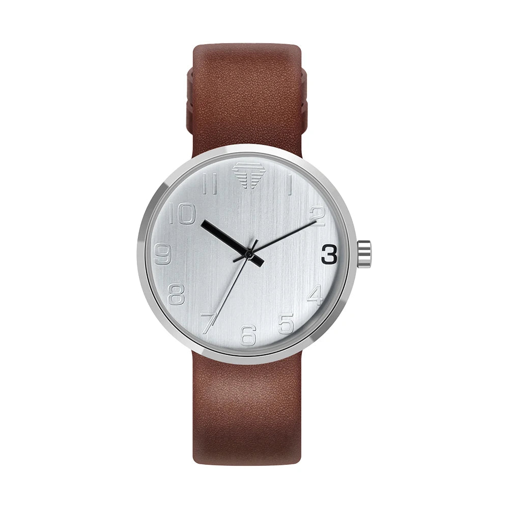 Watch with brown leather strap and silver case on white background
