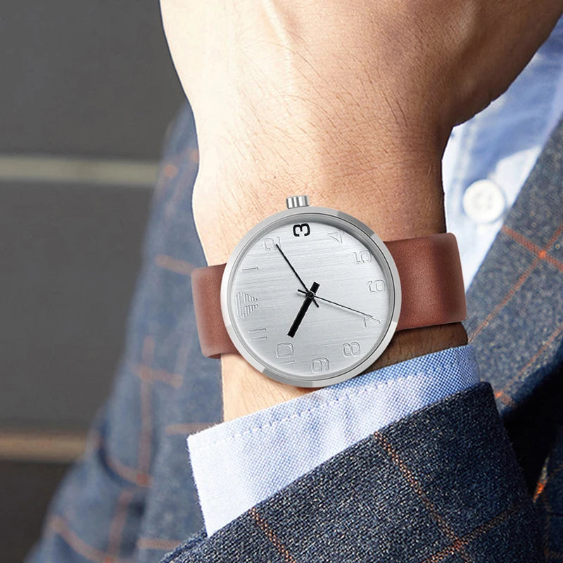 Wrist wearing a silver watch with a brown leather strap, close-up shot.