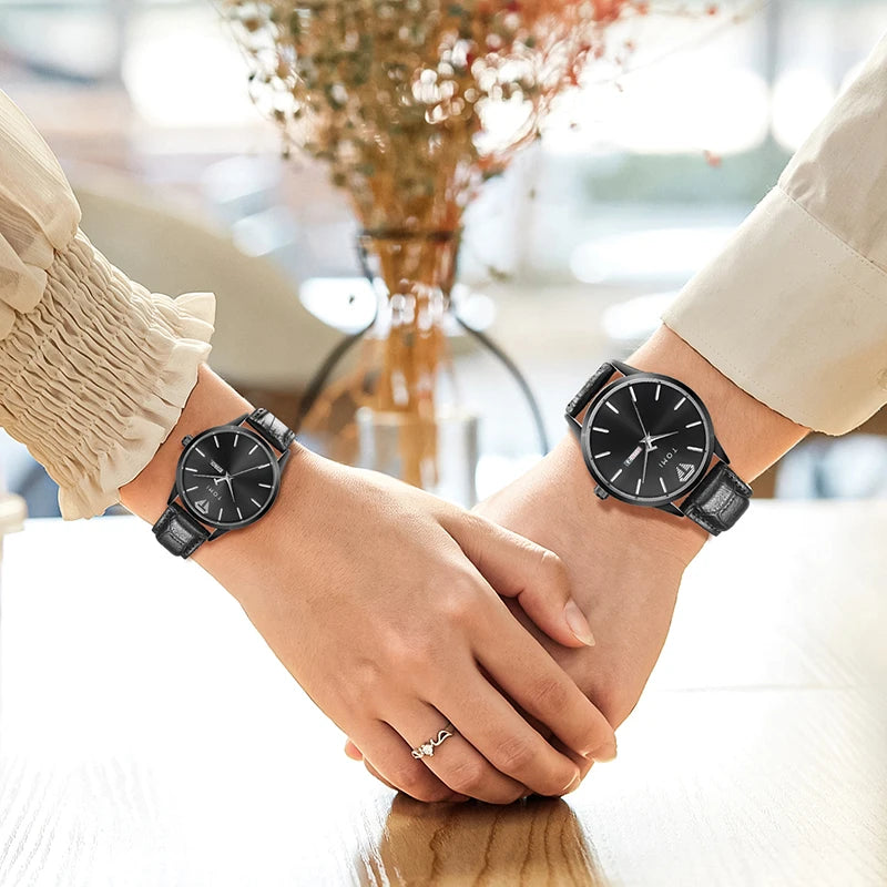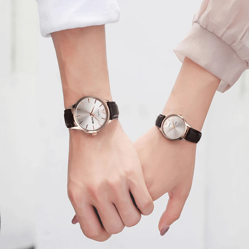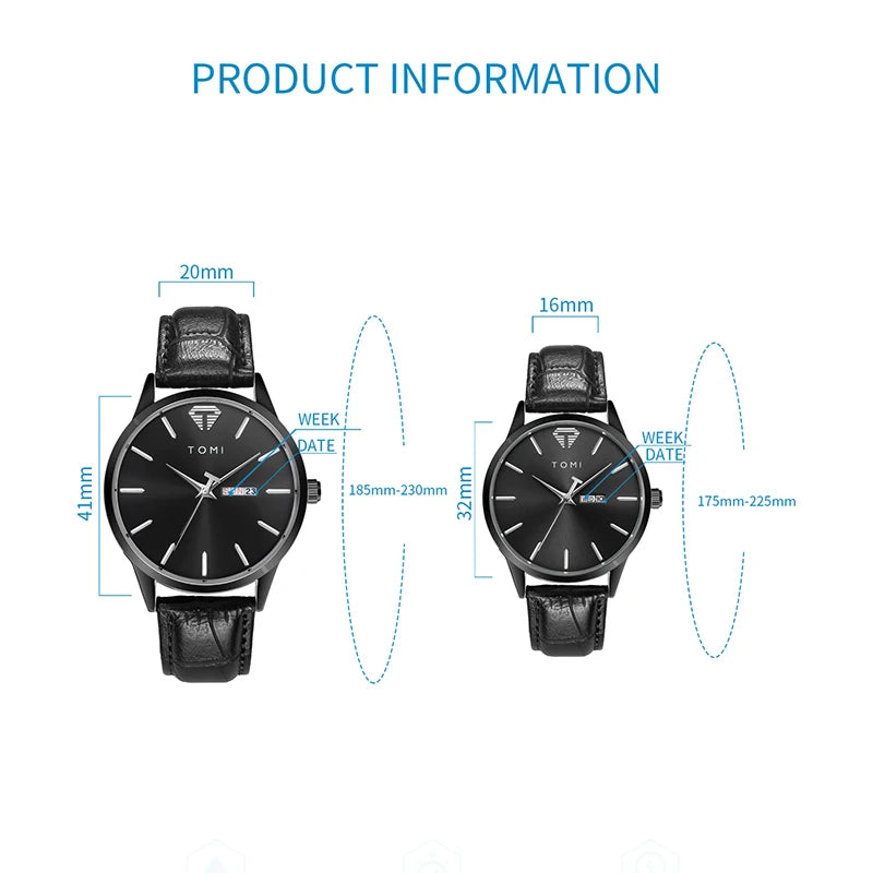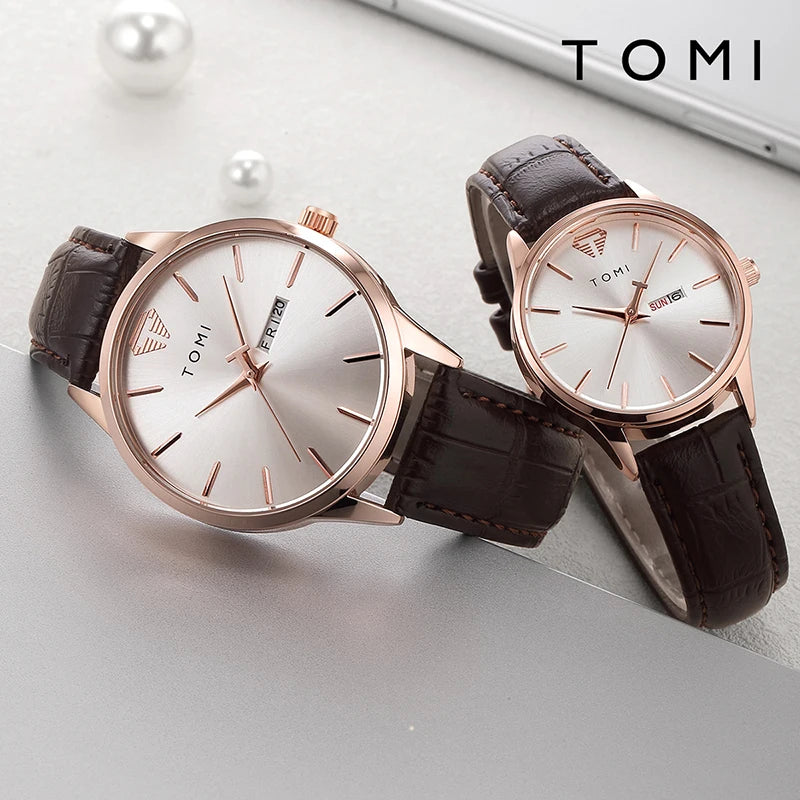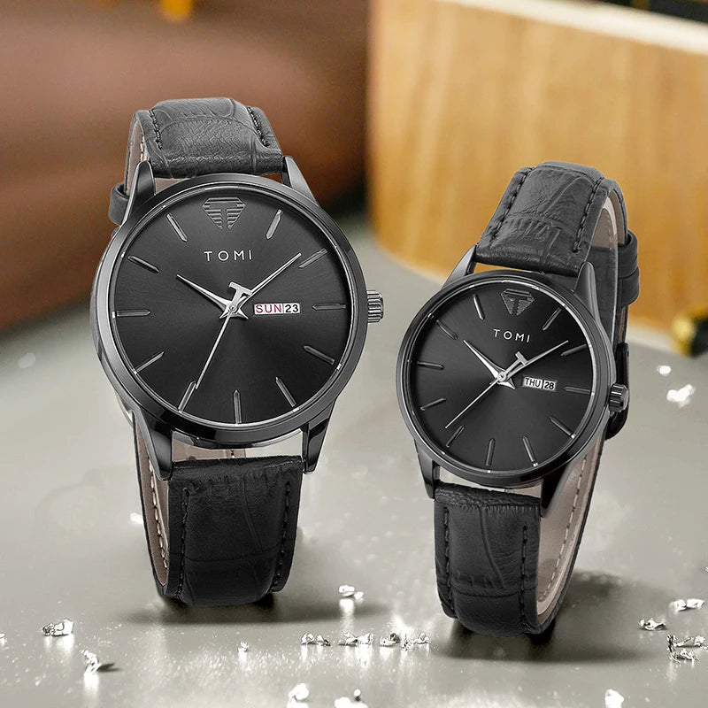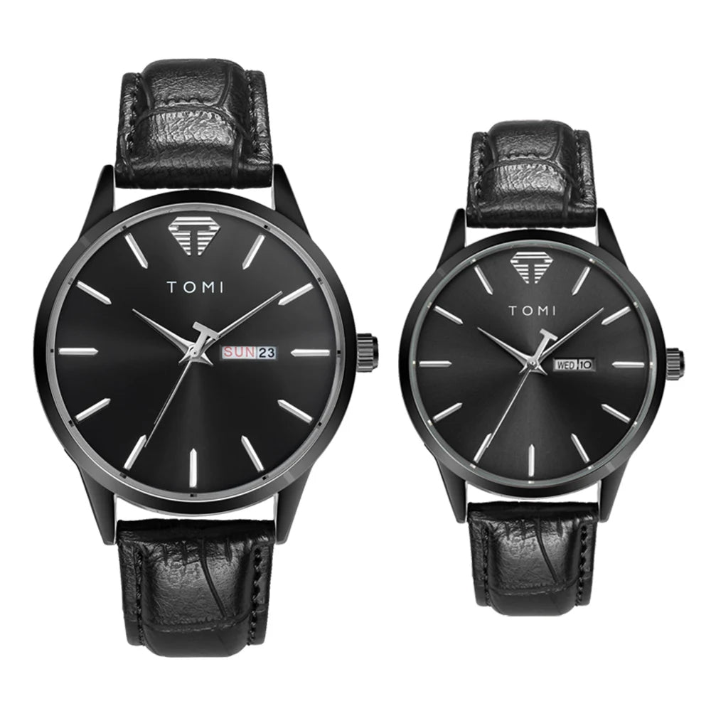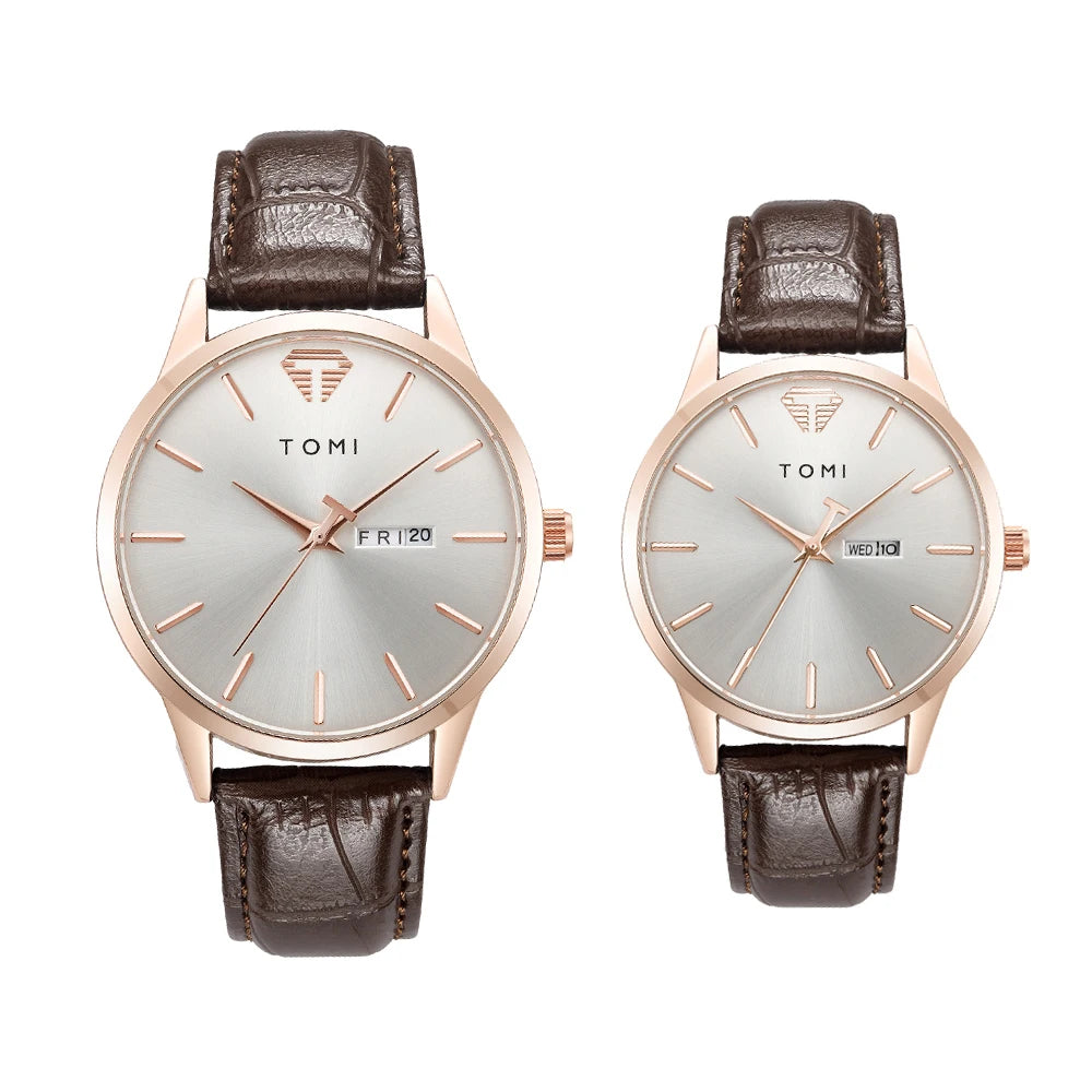TOMI presents the T045+T046 Eternal Bond Couple Set, a matching pair of timepieces crafted with Alloy case and PU band. This romantic set includes two round watches featuring complete calendar and week display with numberless design. Powered by precision quartz movement with 3Bar water resistance and glass crystal protection. The perfect gift for couples, combining functional elegance with shared style.
