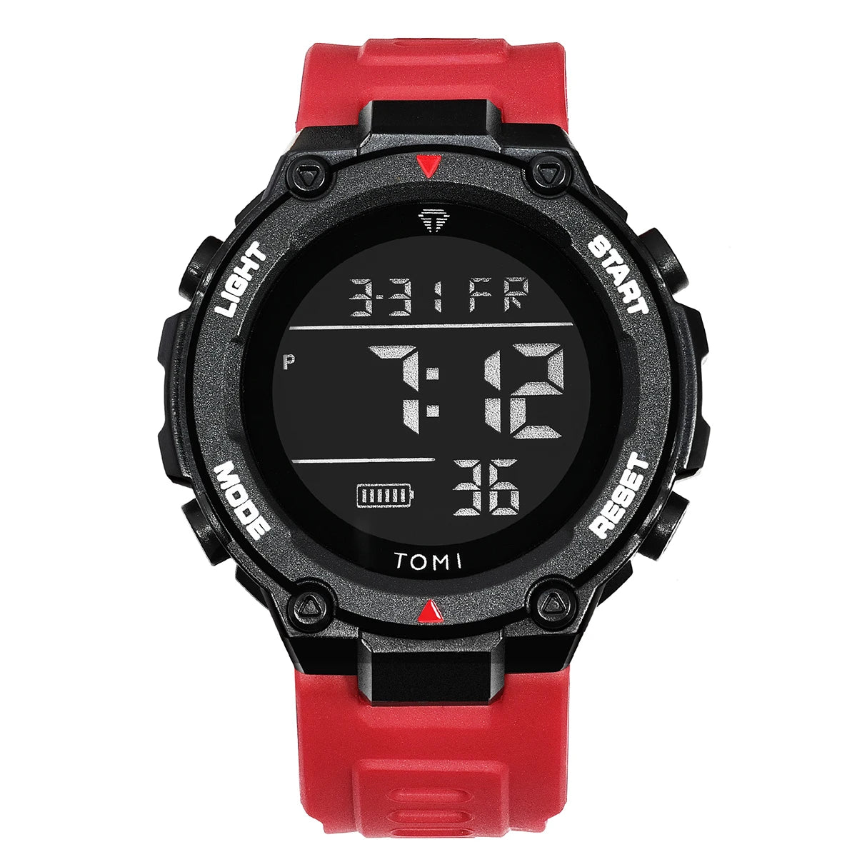Digital watch with a red strap on a white background