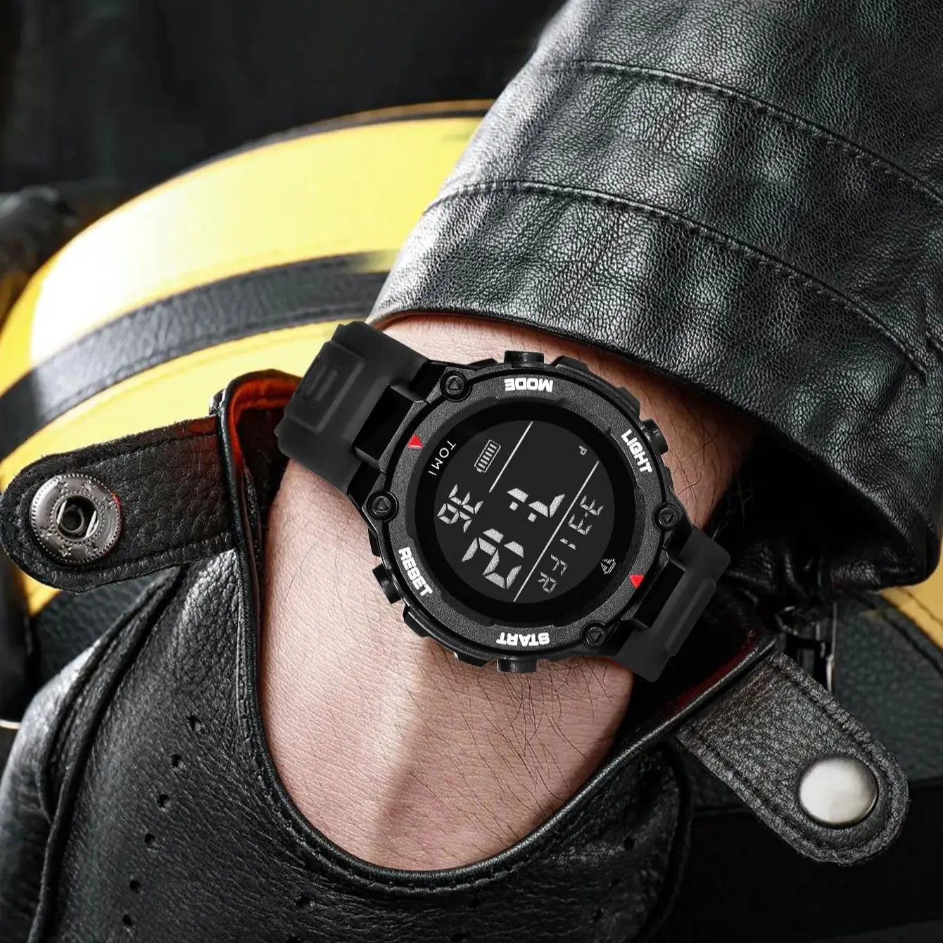 Person wearing a black digital watch with a yellow helmet in the background