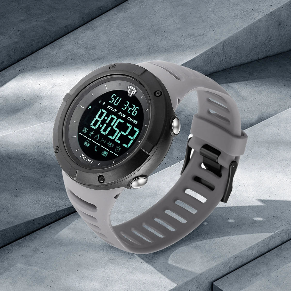 Digital watch with gray strap on a concrete surface