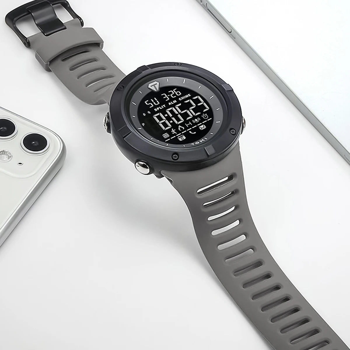 Digital watch with gray strap and black display on a white background