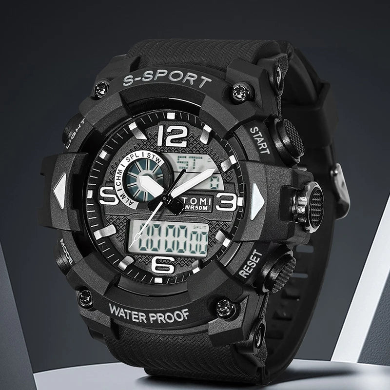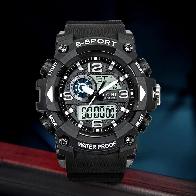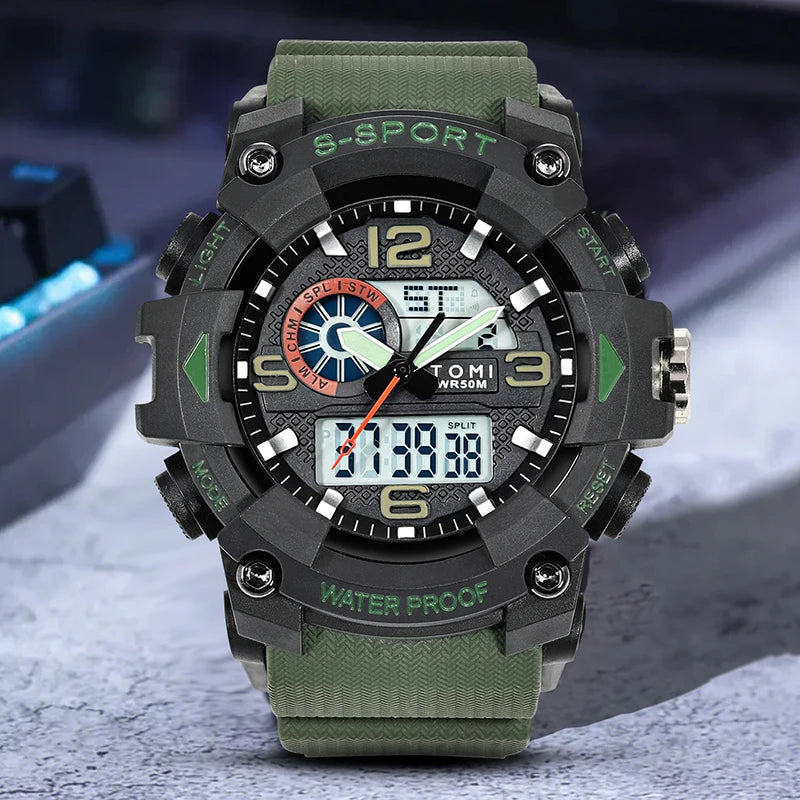 TOMI introduces the T231 Viper Strike, a timepiece crafted with Polyester case and PU band. This extreme military-grade watch features an advanced hybrid analog-digital display with high-visibility luminous green screen, complete calendar, and week display, all housed in a massive 52mm case with six-point hexagonal protective cage construction and Digital movement with 3Bar water resistance. The commanding 16mm case thickness combined with military olive sport band delivers maximum shock protection and field-ready aesthetics, representing the ultimate tactical watch for special operations and extreme outdoor missions.