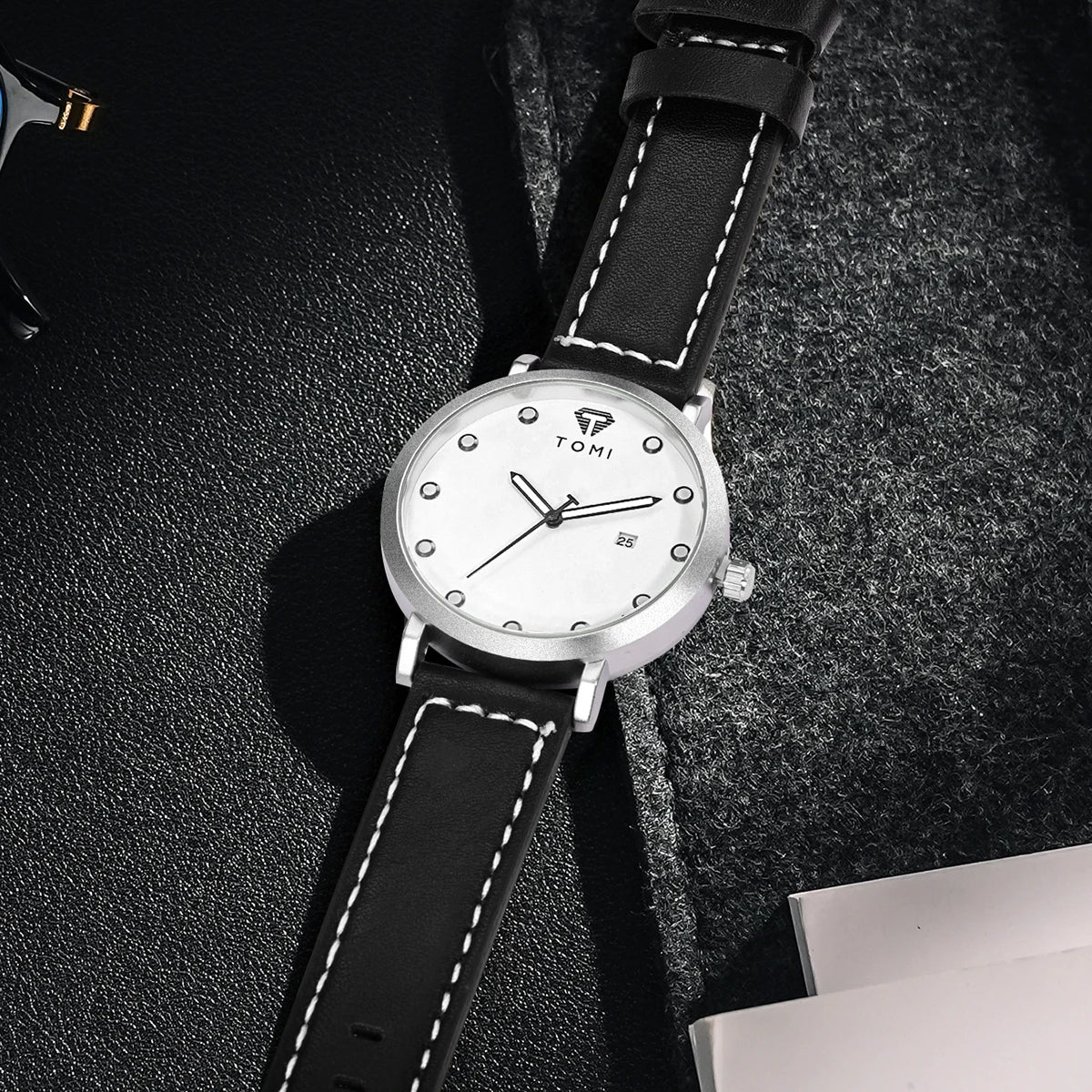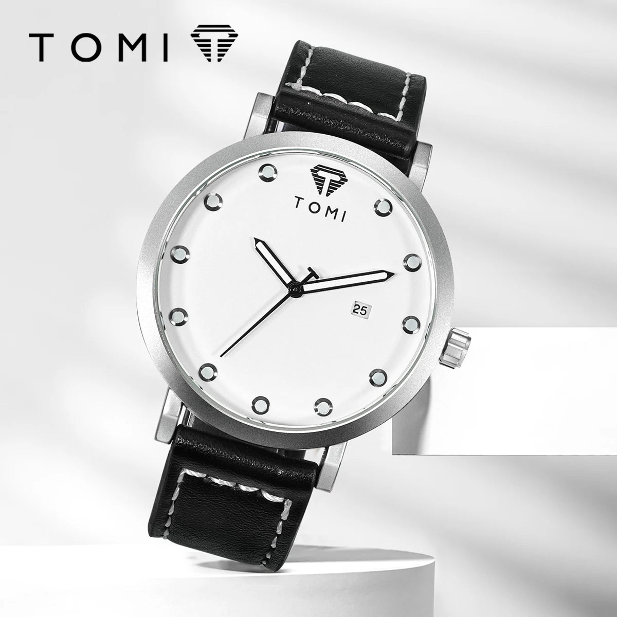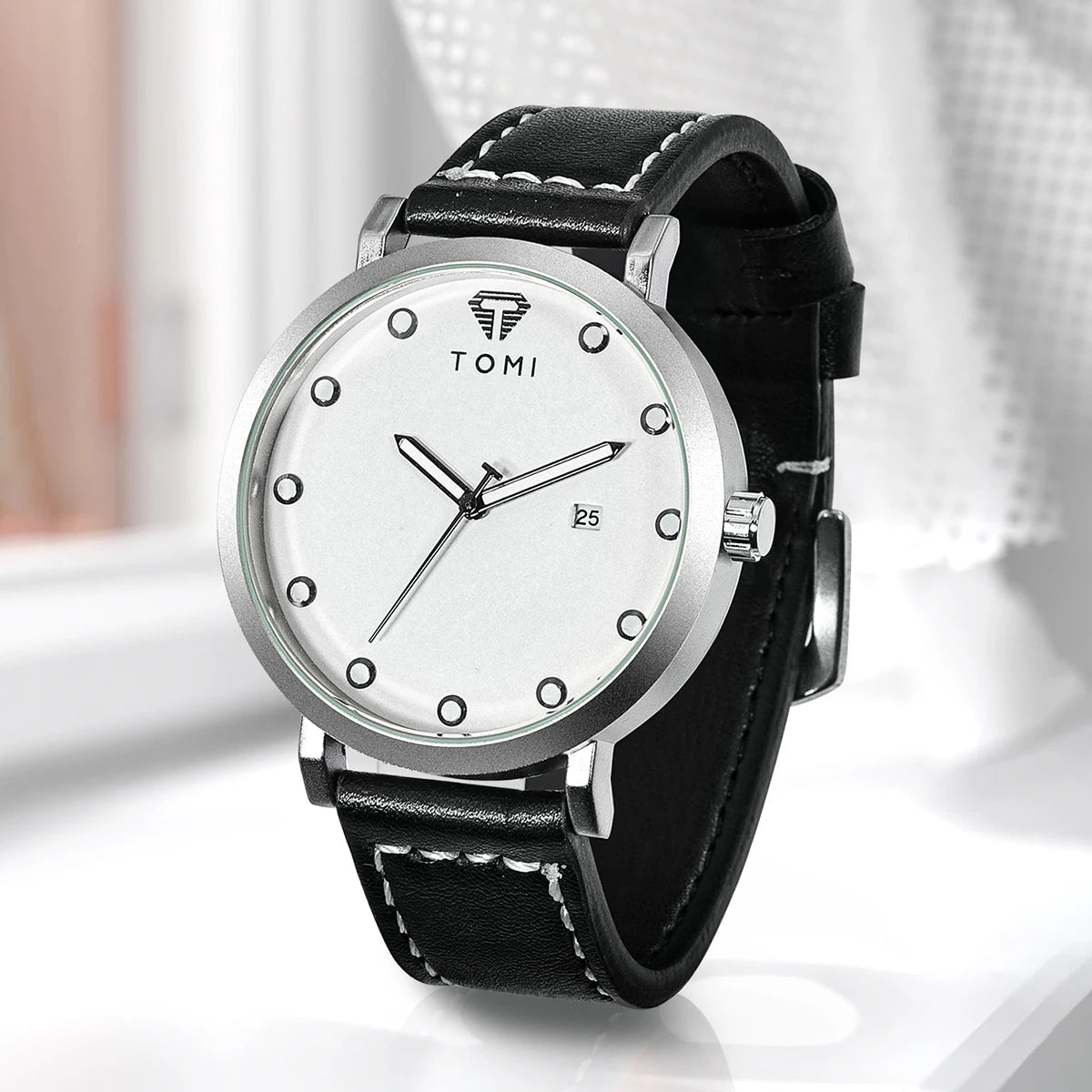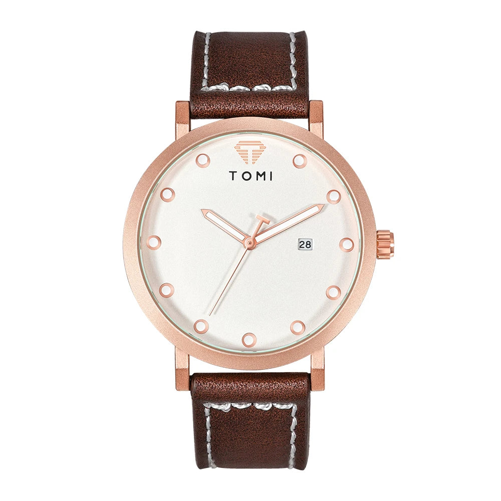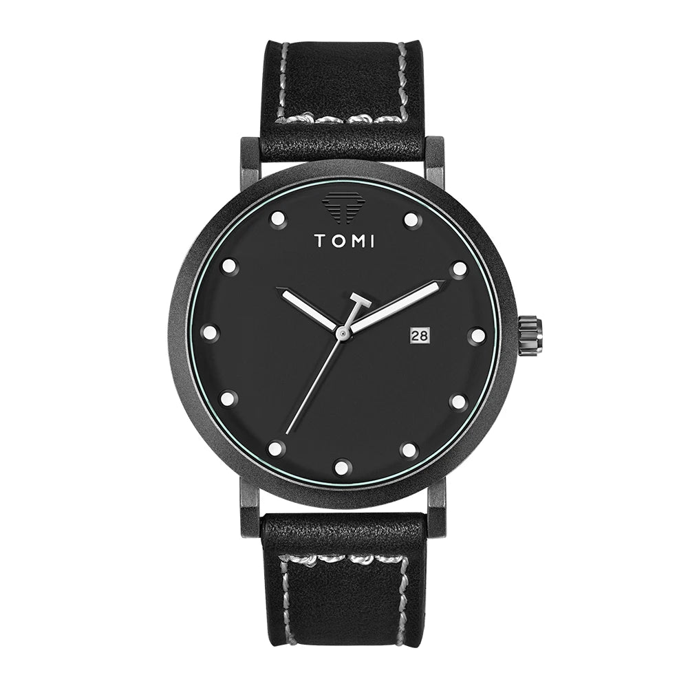 TOMI introduces the T074 Noble Cadence, a timepiece crafted with Alloy case and Leather band. This refined minimalist watch features a pristine white dial with applied circular markers and complete calendar function at 6 o'clock, powered by precision Quartz movement with 3Bar water resistance. The ultra-slim 10mm case combined with contrasting black leather band with white stitching delivers timeless elegance, making it perfect for those who appreciate understated sophistication and versatile style for both professional and casual settings.
